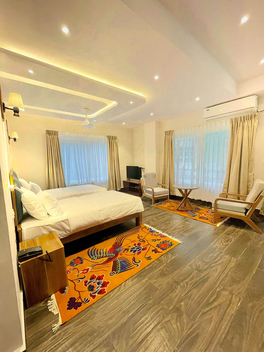 Perfect for 2 adults or 1 adult + 1 child. Cozy, comfortable, with some rooms offering balconies and views. Includes: mini fridge, tea/coffee setup, smart TV, ensuite bathroom, safety box, iron, and 10-inch mattress with 300 TC sheets.